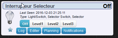 Il s’agit de piloter ce capteur virtuel nomme « Selector switch » ou l’on peut prédéfinir 4 niveaux (pour des dimmables par ex, ou des volets)